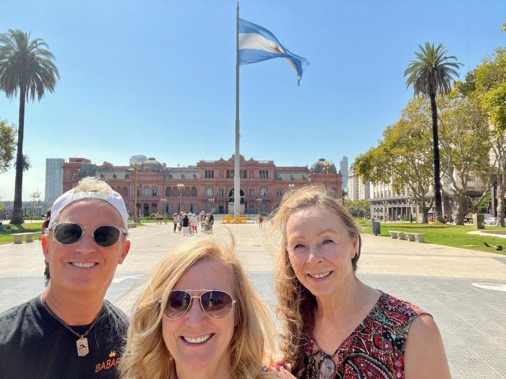 Our crew member Tim joined us on the city tour. Behind us is the Casa Rosada. (Pink House) The palatial mansion is known officially as Casa de Gobierno (House of Government). A fun fact is the President of Argentina will not go in a car, he arrives at Casaa Rosada by Helicopter. Behind the Casa Rosada is a big heliport.