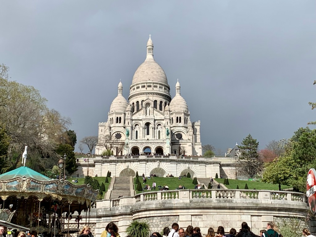 Montmartre is a large hill in Paris. The church above is the Sacra-Couer Basilica. This Roman Catholic Church sits on top of the hill. On top of the hill is a bohemian village. The village is filled with artists that are painting , restaurants and cobblestone streets.